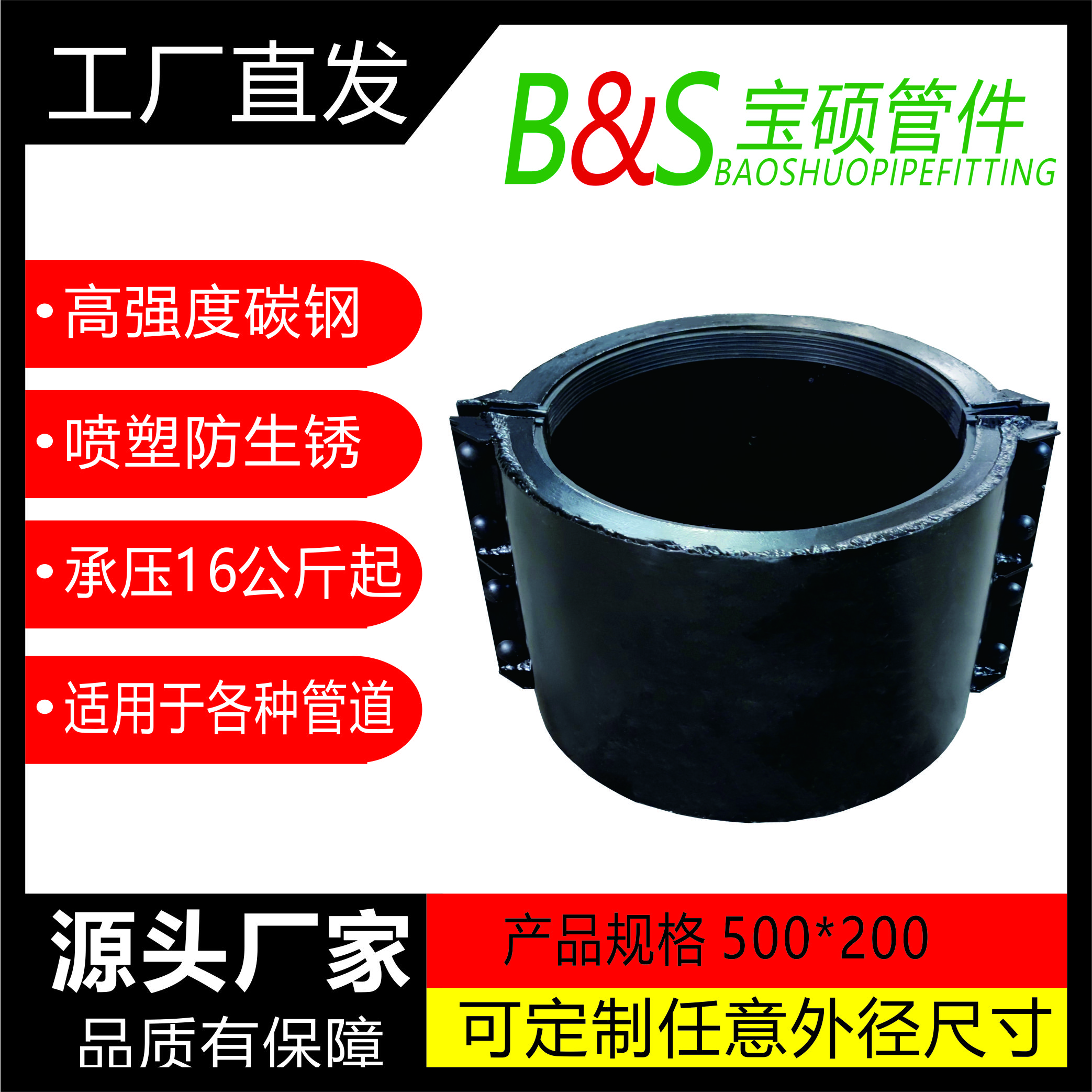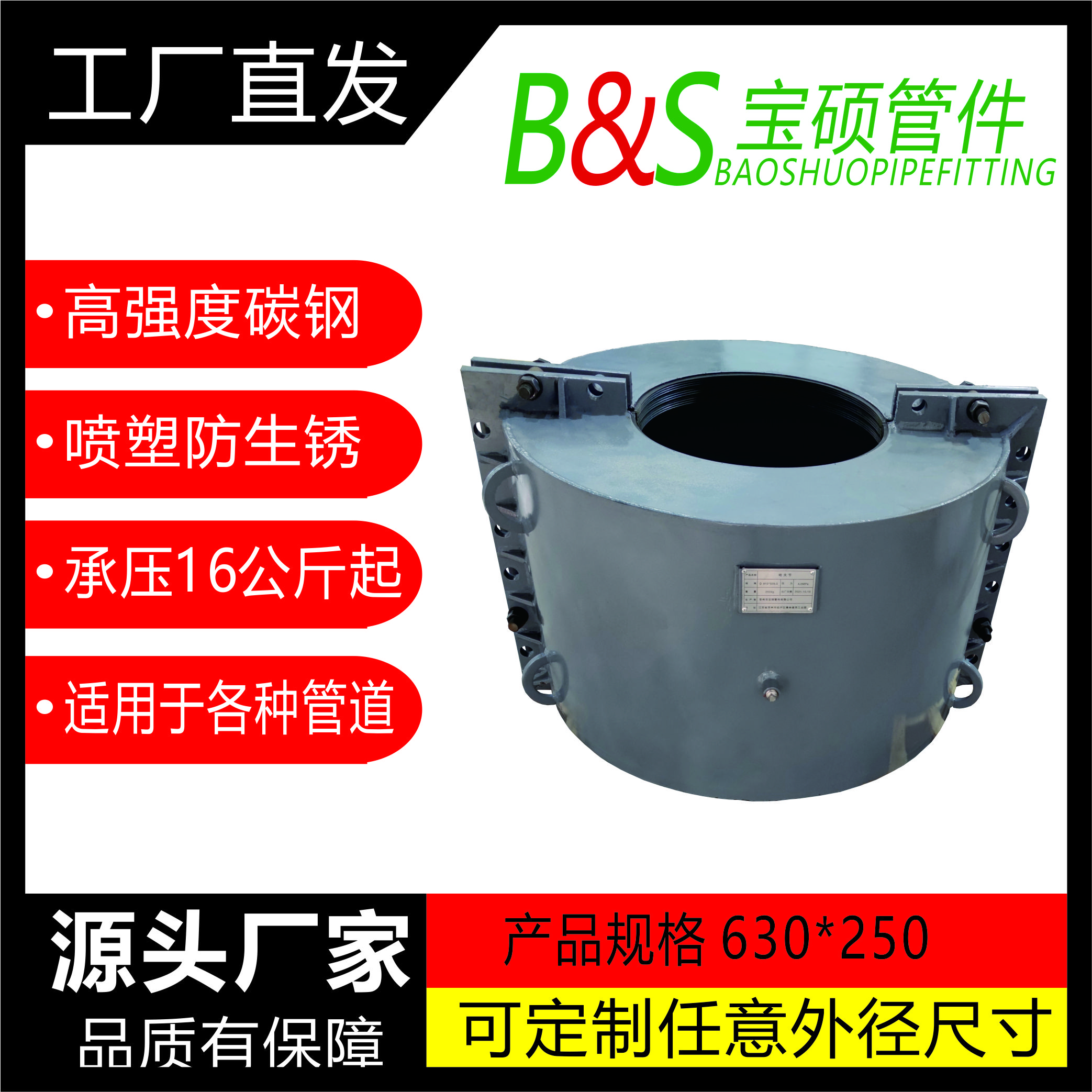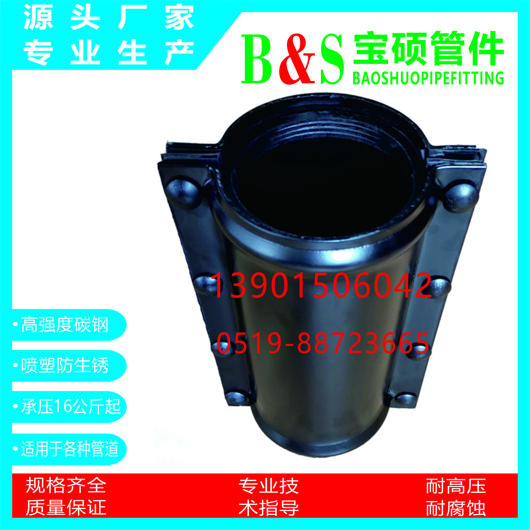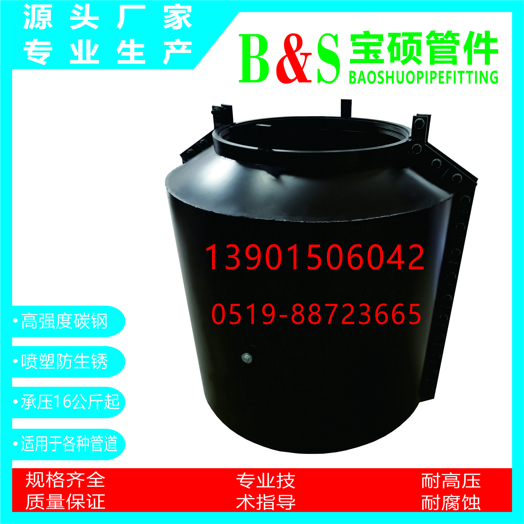 常州市宝硕管件有限公司【常州市宝硕宏图管道配件有限公司】是生产各种管道哈夫节,三通哈夫节,弯头哈夫节,异径等管件哈夫节;高压哈夫节,耐油哈夫节,耐高温哈夫节,耐腐蚀哈夫节,碳钢哈夫节,304.316.316L不锈钢哈夫节。马鞍三通管卡,四通管卡;哈夫三通管卡,四通管卡;承插钢塑管件;柔性快速接口.........
